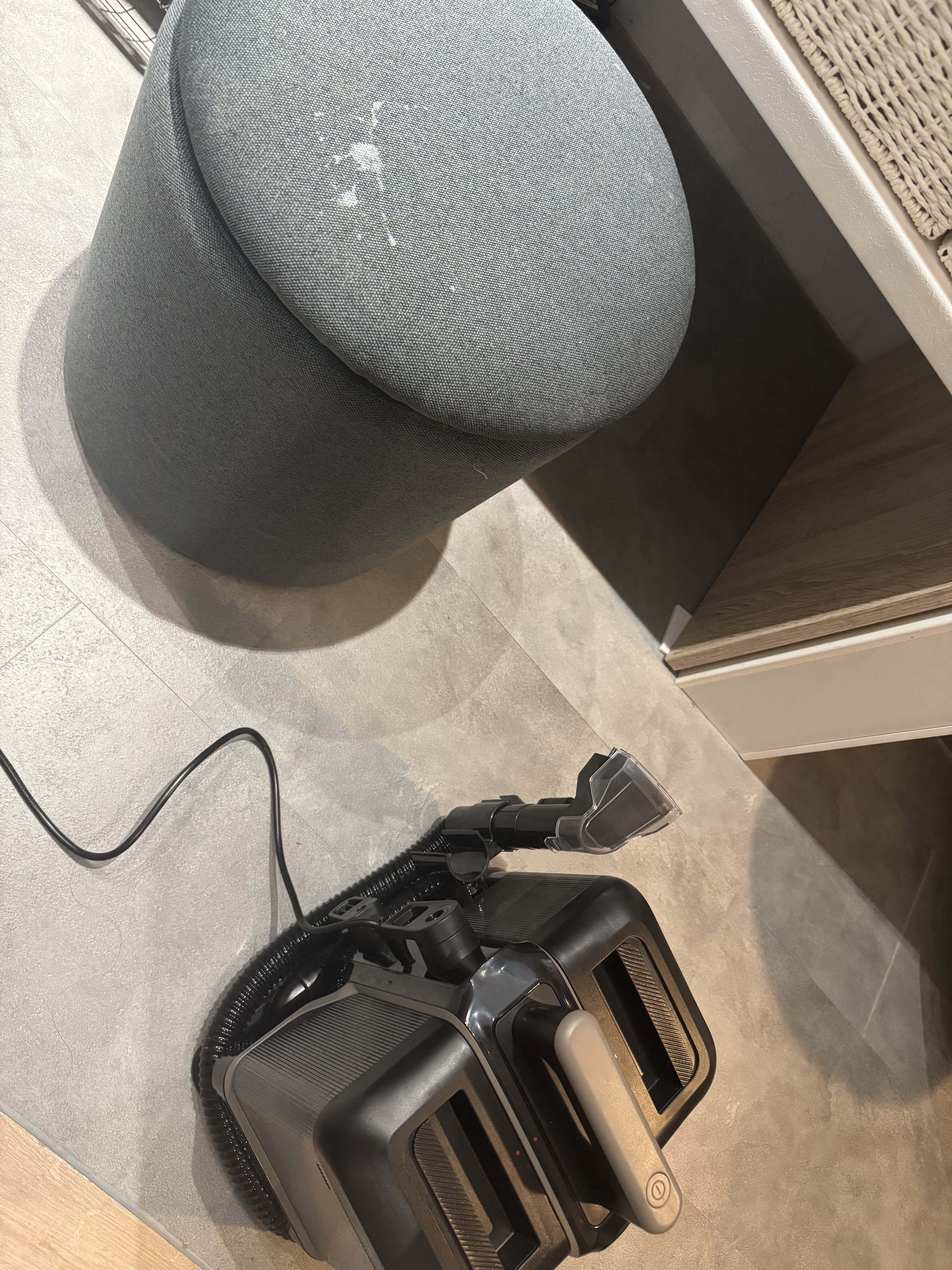 左が何もしていない状態。右が綺麗になった状態。写真だとうまく伝わらないけど明らかに汚れが落ちて少し明るくなった。掃除機のウォータータンクはコーヒーみたいな色の汚水が出た。怖い。