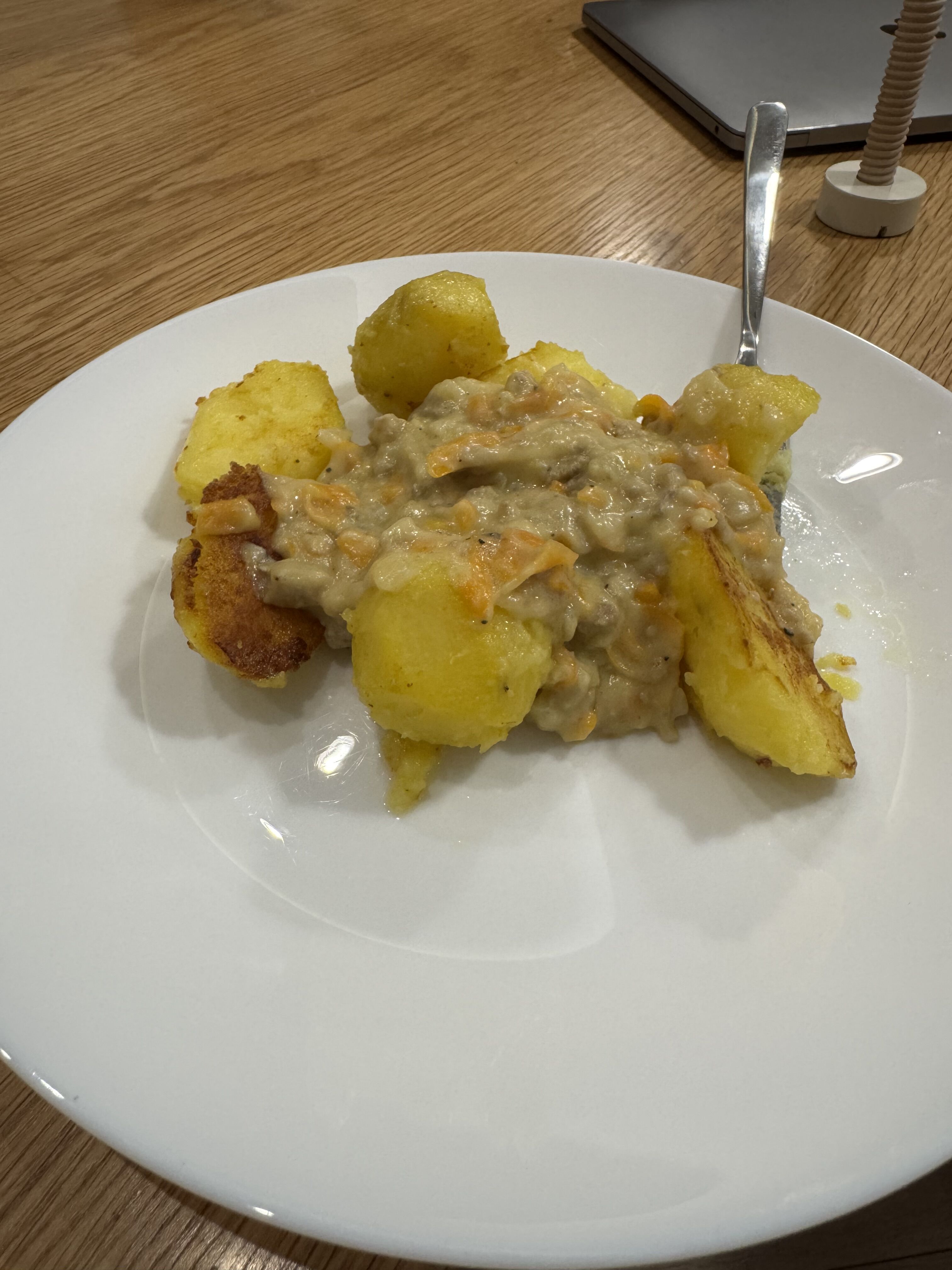 ふかしたじゃがいもとひき肉ソース。ひき肉ソースは頻繁に出る。 時間が経ったじゃがいもは美味しくないということでバターで炒められたりしている。日本だと古いご飯をチャーハンにしたりお茶漬けにしたり…するよね?