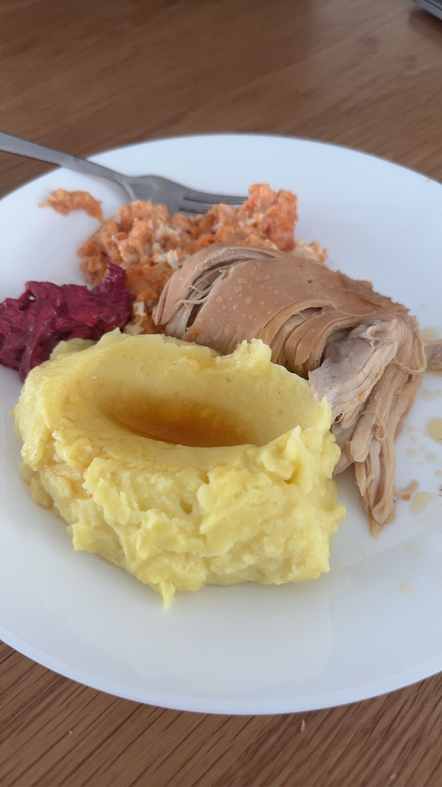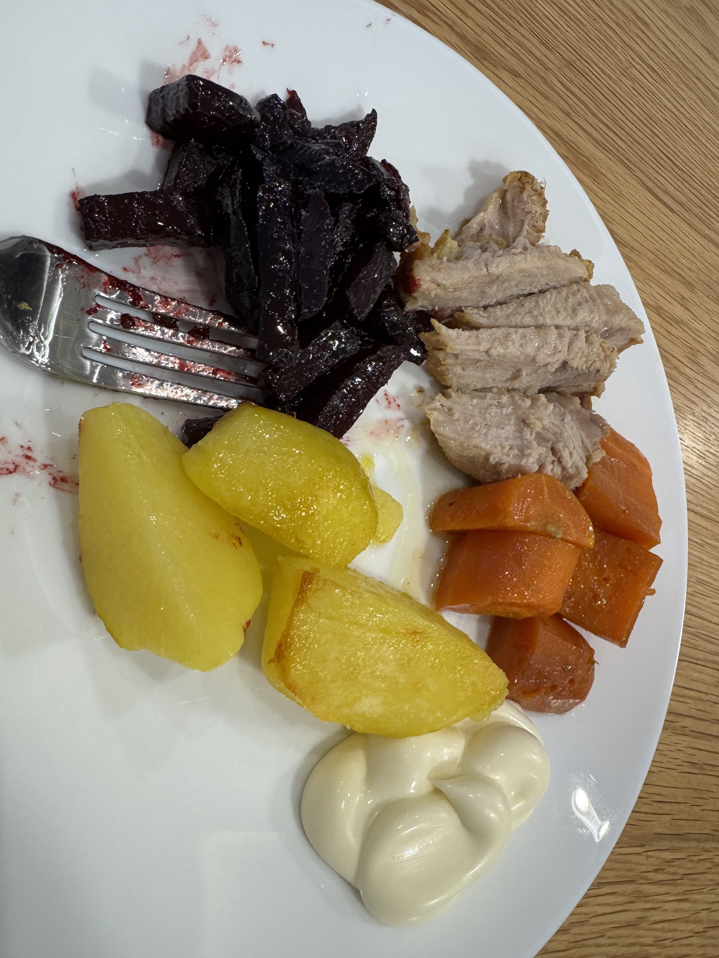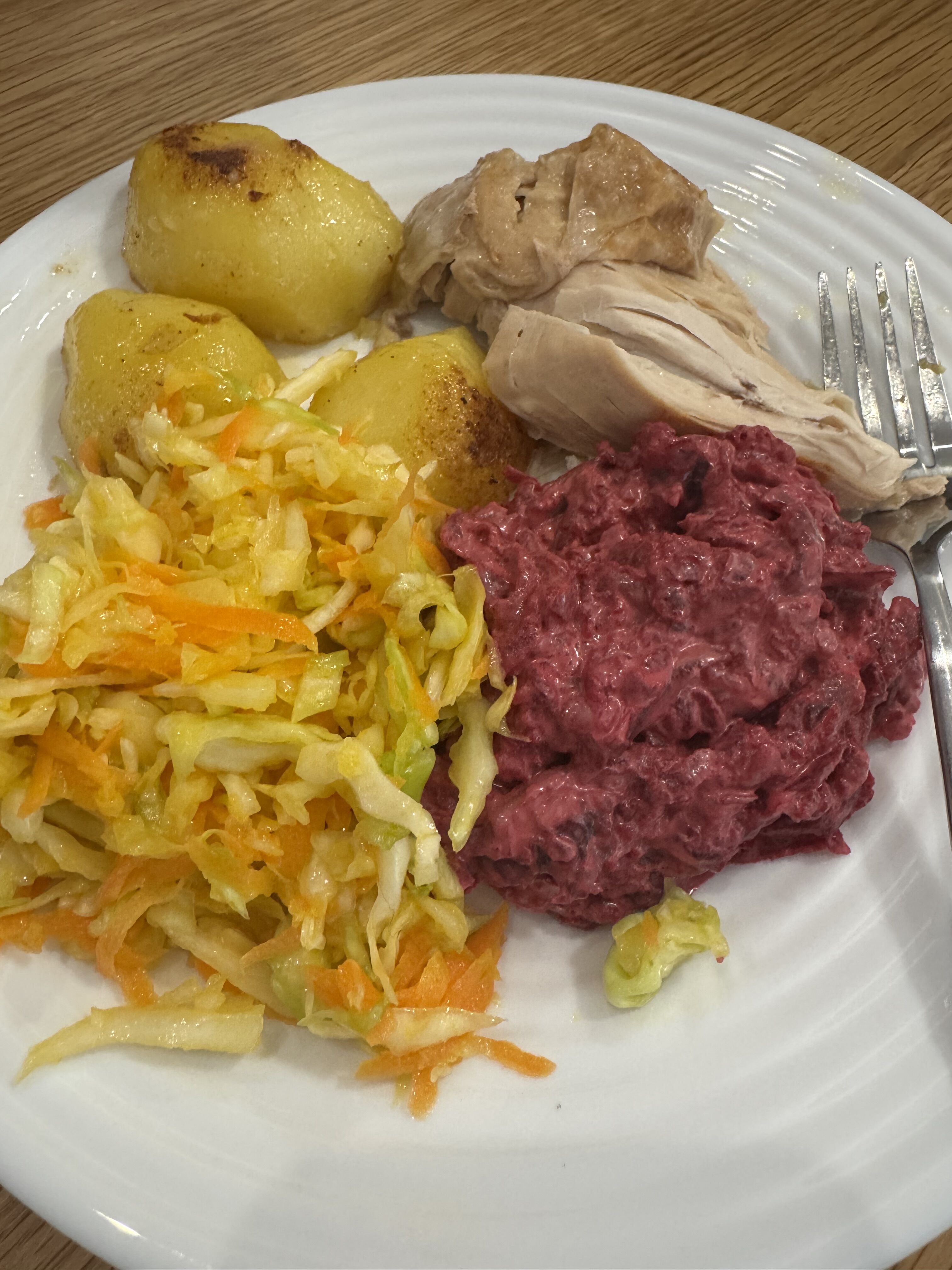 ザワークラウト(サワーキャベツ)っぽいサラダとビーツサラダ、ローストチキンとポテト。 にんじん玉ねぎジャガイモと肉を入れたオーブン料理みたいなのも結構よくある。