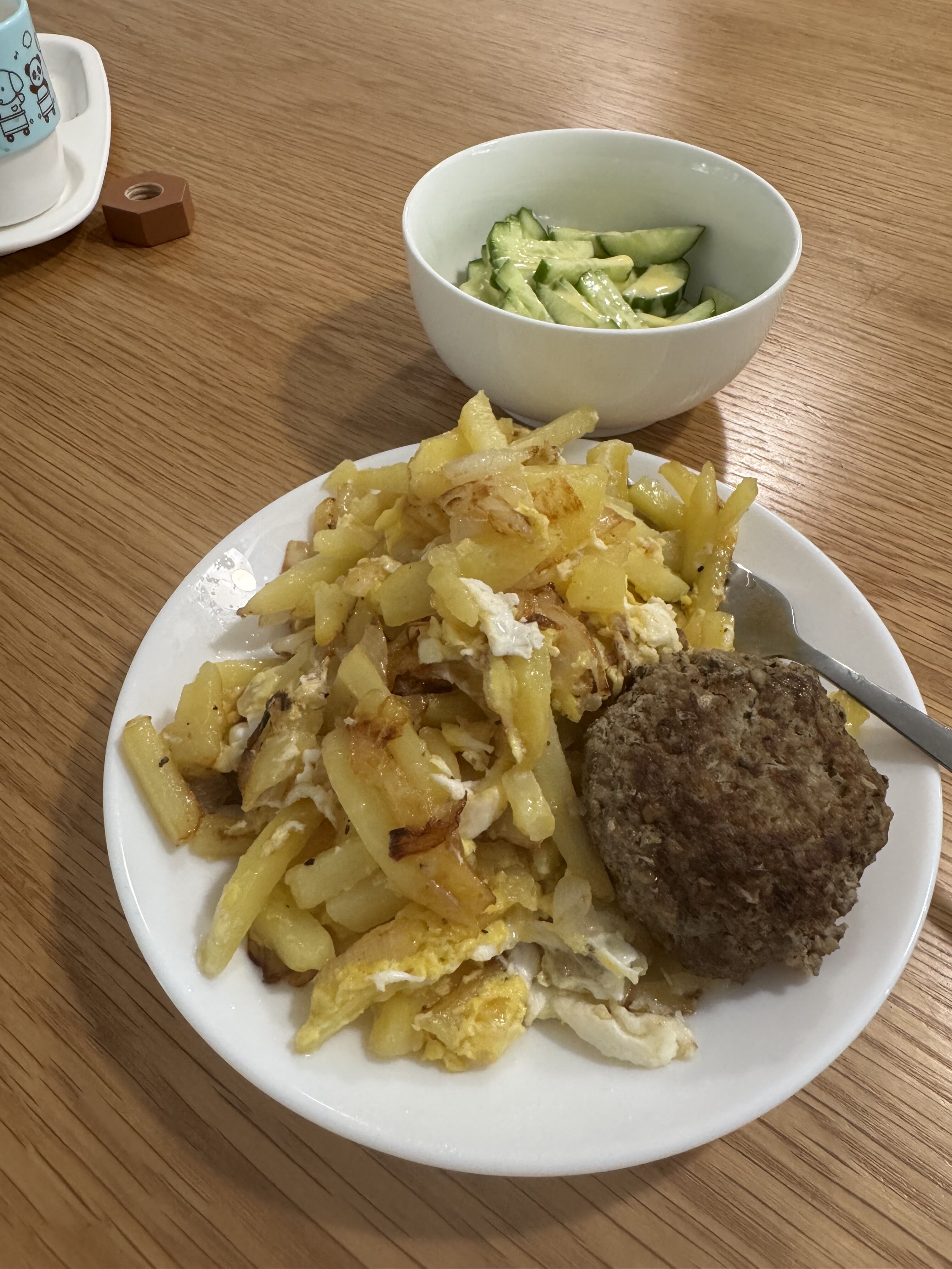 おそらくkotlet。おそらく前にふかしたジャガイモが再利用されて卵と炒ってある。